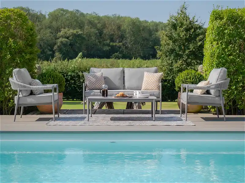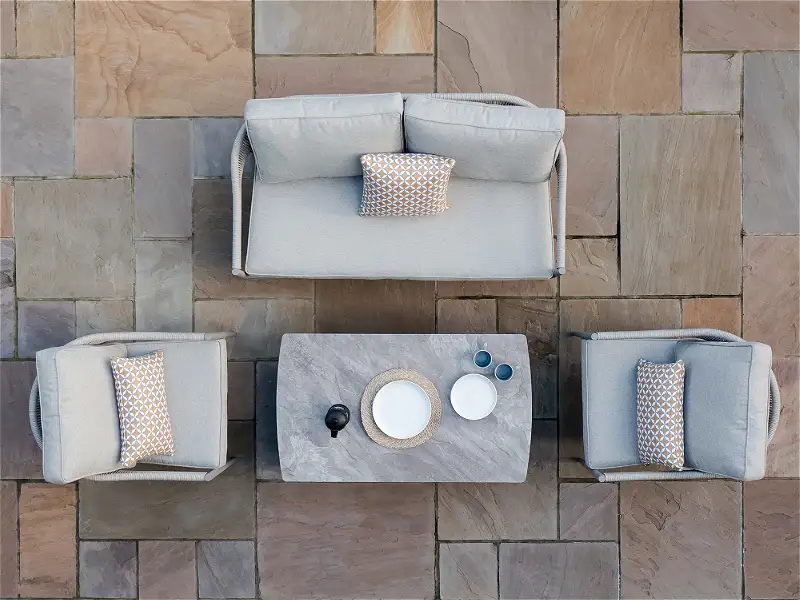 The rope weave finish brings a tactile quality to the furniture, providing a fresh alternative to more traditional rattan or metal options. This unique texture helps the set stand out while remaining neutral enough to blend with brand colours, soft furnishings, and natural landscaping.