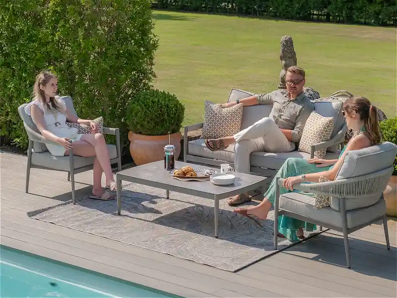 The Florence rope weave sofa set includes 1 x cushioned sofa, 2 x matching armchairs, and 1 x coordinating coffee table, offering a complete layout that invites guests to settle in, engage in conversation, or simply unwind in a welcoming space. Its unique rope weave detailing adds a refined, modern texture to your setting, instantly lifting the visual appeal of any outdoor zone. Whether you’re aiming for a chic, relaxed garden feel or a high-end hospitality suite aesthetic, this set delivers in every way.